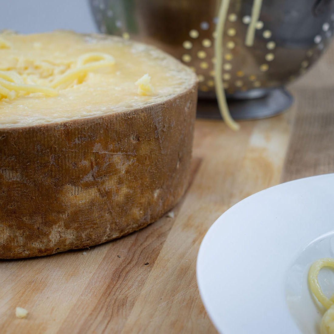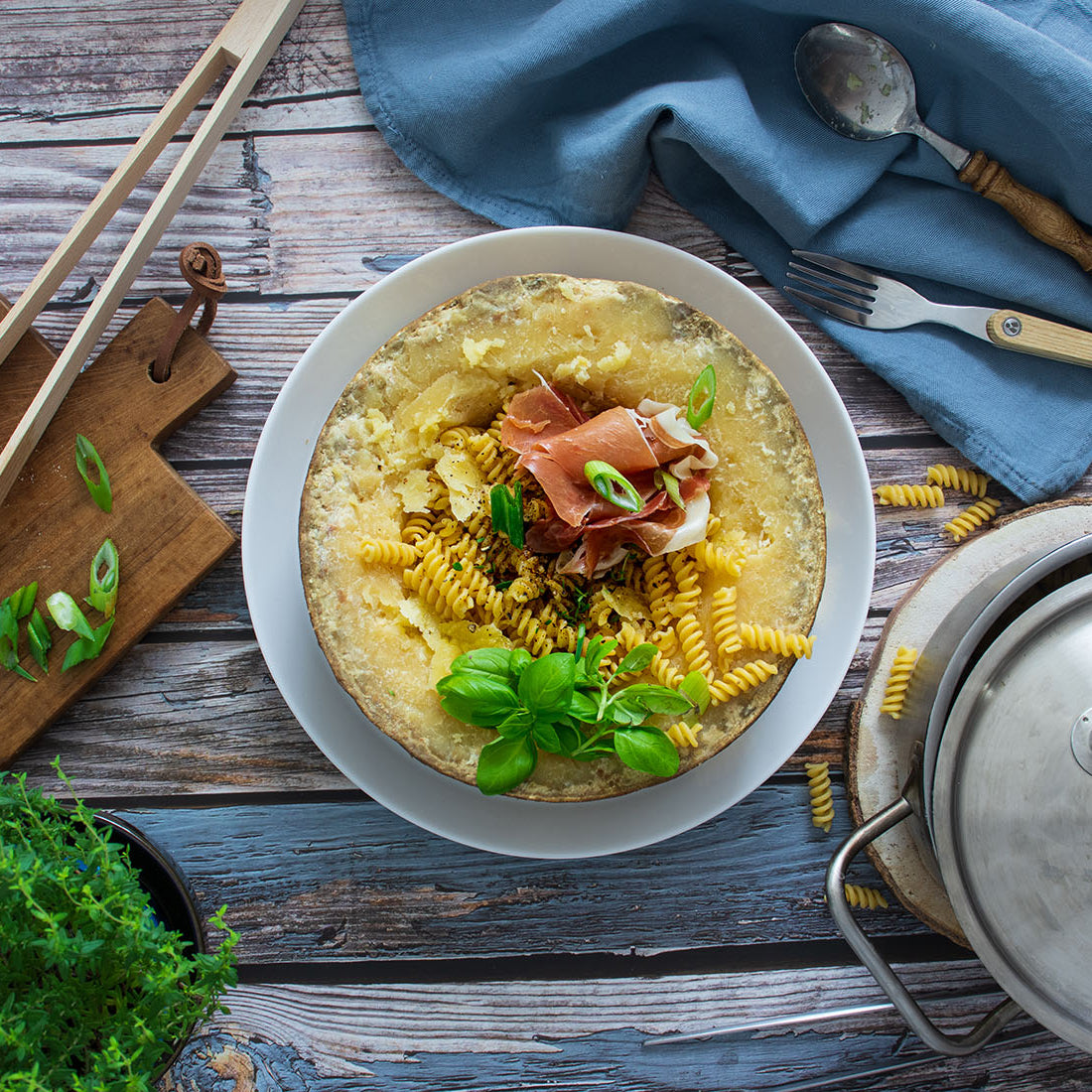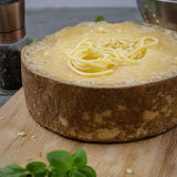 Wenn du aber auch einmal deine Spaghetti im Käselaib wenden möchtest, dann wähle den Laib aus. Und du bekommst ein Stück vom Laib dass ca 1,8-2,2 kg wiegt.